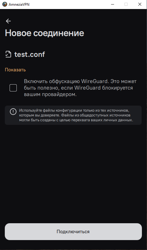 После импорта файла создайте новое подключение. Опция «Включить обфускацию» настраивается по вашему усмотрению. Если возникают проблемы с подключением, можно попробовать включить эту опцию, однако в большинстве случаев, особенно если стандартное приложение WireGuard работает корректно, ставить галочку необязательно.