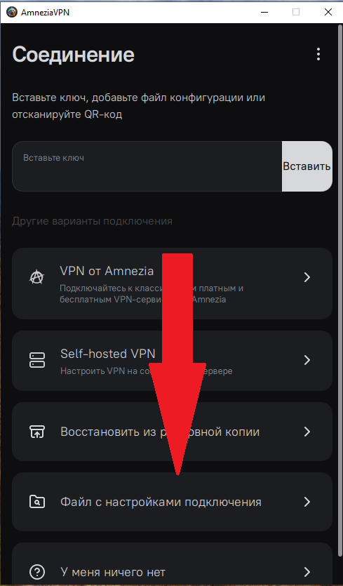 Первое, что необходимо сделать – импортировать конфигурационный файл, который вы приобрели для AmneziaWG. На скриншоте показано, что нужно нажать на кнопку «Файл с настройками подключения», а затем выбрать соответствующий файл на вашем устройстве.